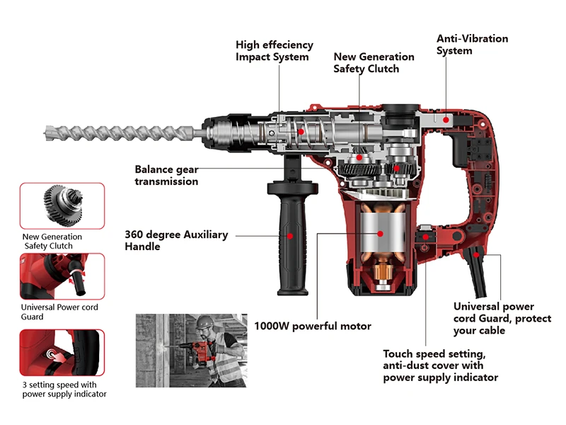 ● Угол долбления регулируется 8-ступенчатым фиксатором, что позволяет адаптировать инструмент к любой рабочей ситуации (например, при использовании долота для плитки).